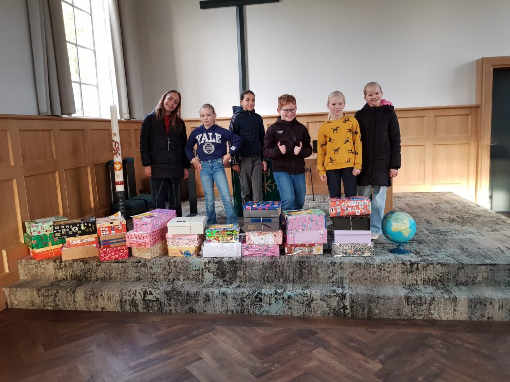 Samen met kinderen van de basisschool de Zevenster hebben we meegedaan aan de schoenendoosactie. Een aantal kinderen van de basisschool hebben de gevulde schoenendozen naar de kerk gebracht. En ook gemeenteleden hebben een donatie of een schoenendoos ingeleverd. Afgelopen zondag hebben we met de kinderen van de kinderkerk aandacht besteed aan samen delen, we gingen kijken waar de schoenendozen naar toe gaan, verspreid over de wereld. We zijn allemaal verschillend, zien er verschillend uit, zijn verschillend opgegroeid en toch zijn we allemaal kinderen van God.