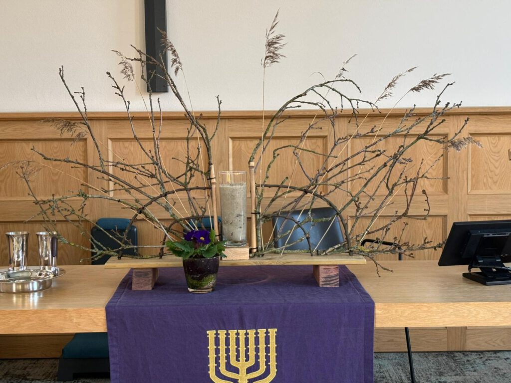 Bij de ingang heeft u, als het goed is, een liturgische schikking zien staan. Dit stuk is gemaakt naar aanleiding van Johannes 19, vers 30 Hij zei: ‘Het is volbracht.’ Hij boog zijn hoofd en gaf de geest.