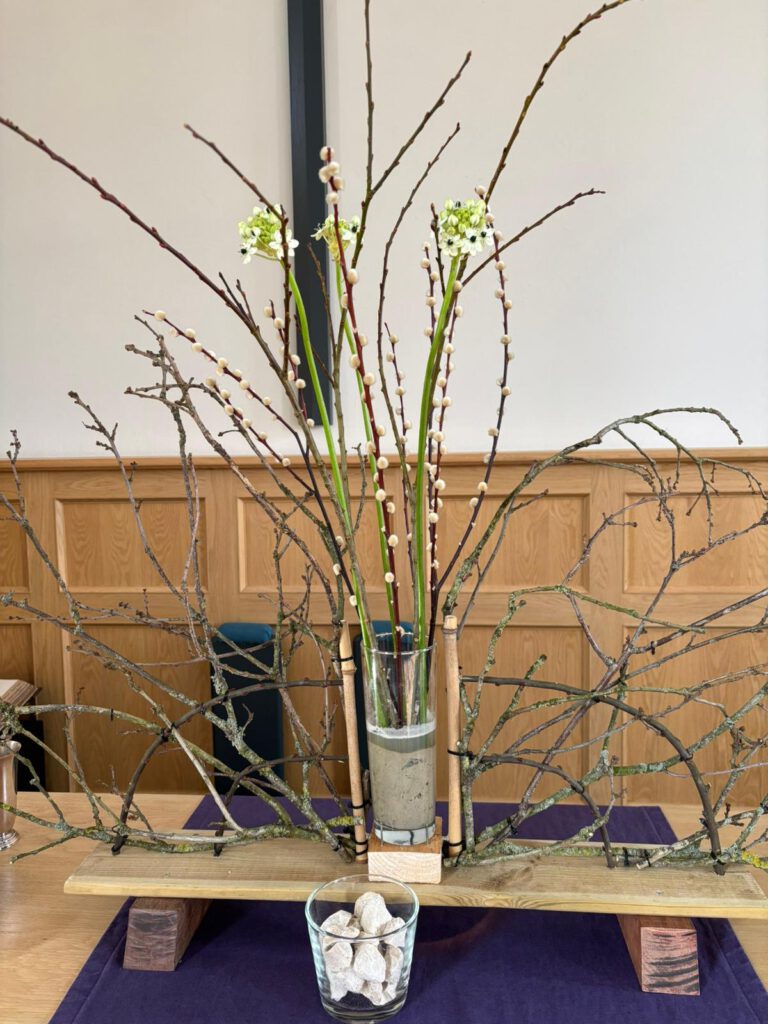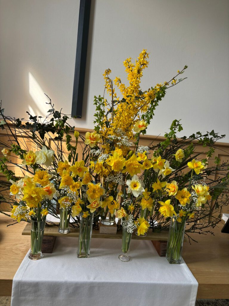 Laat je op de paaszondag en in de komende tijd verrassen door de werking van de heilige Geest! Het is een feestelijke schikking geworden, in de waaier ziet u gipskruid, krentebloesems en andere uitbottende takjes en natuurlijk vele narcissen , als symbool van de lente.