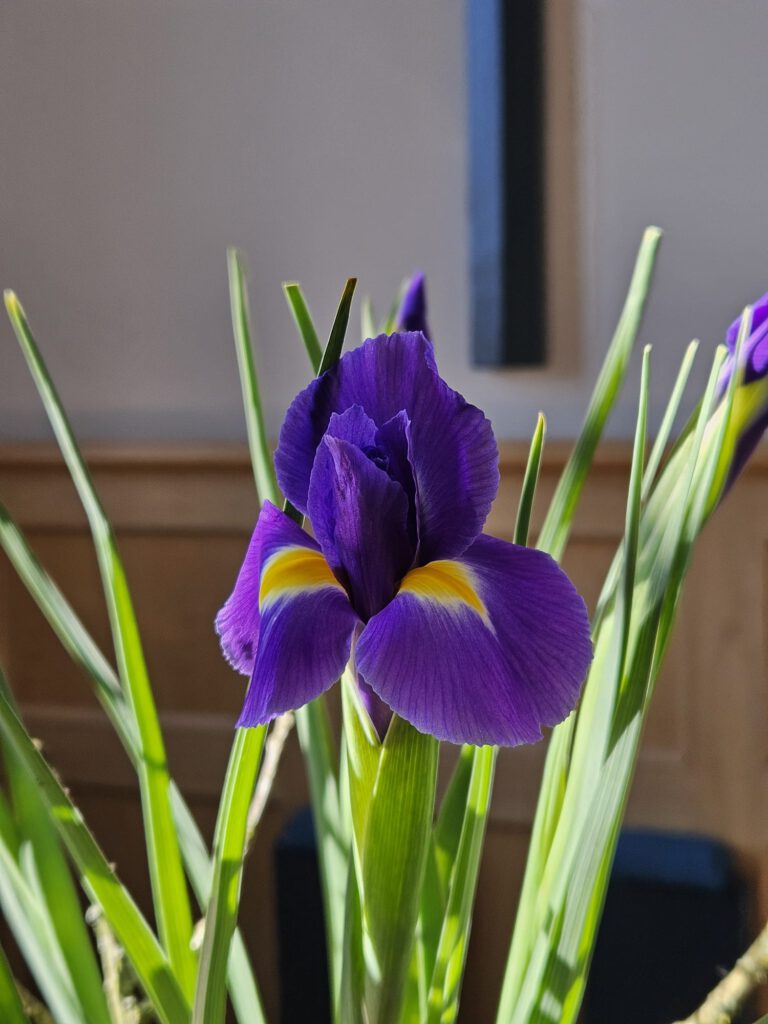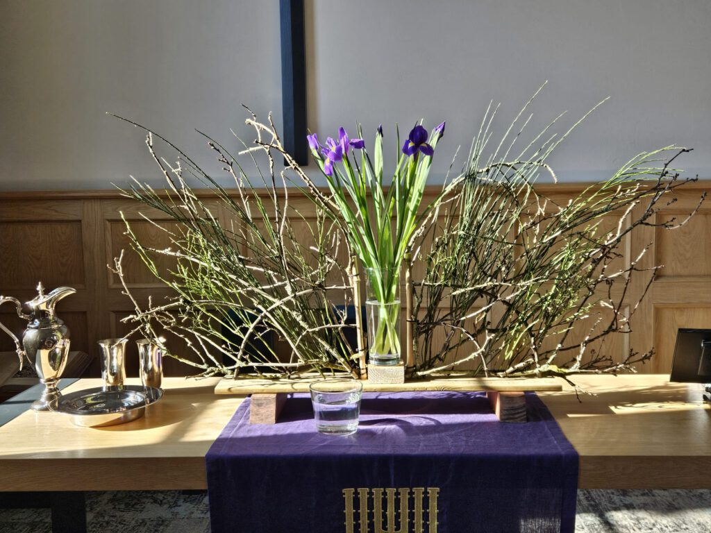 Jezus verliet Judea en ging weer naar Galilea. Daarvoor moest hij door Samaria heen. Jezus kiest een ongebruikelijke route. Op het stille middaguur ontmoet Hij de Samaritaanse vrouw bij de bron. Zij had haar redenen om op dat middaguur water te putten. Jezus vraagt haar om water voor Hem te putten. Ze raken in gesprek. Hij vertelt haar over het levende water. Het wordt een echte ontmoeting. Ontmoetingen zijn betekenisvol wanneer je de tijd neemt voor elkaar, oprecht nieuwsgierig bent, luistert, en vanuit jouw kant vertelt over je eigen leven en je geloof in God. Laat je leiden door de Geest en sta open voor ontmoetingen. De ontmoeting bij de bron staat centraal in deze schikking. De grote vaas is gevuld met water en irissen en de middelgrote vaas met water als verwijzing naar de bron. De iris is een teken voor de drie-eenheid, hemelsblauw, goddelijk geel en zuiver wit. De iris kleurt onze ogen waardoor we kunnen zien naar de ander.