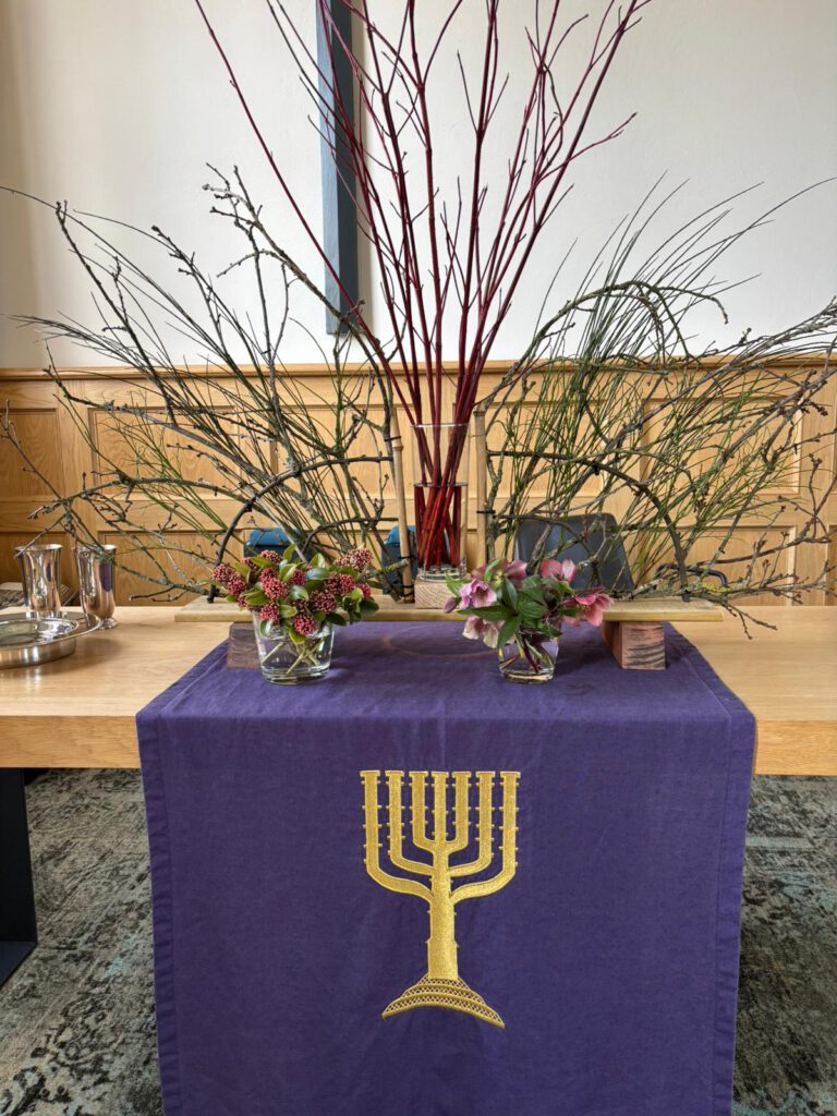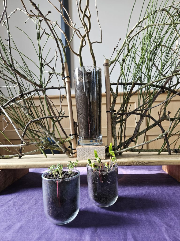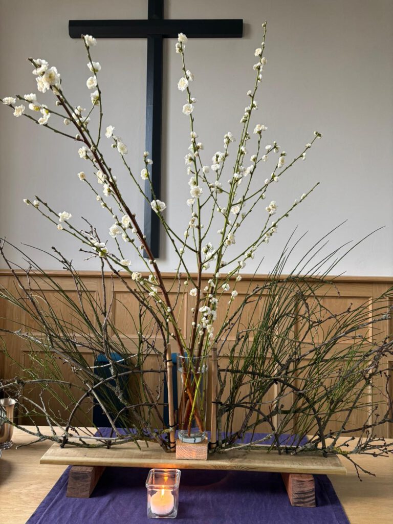 De blindgeborene wordt op wonderbaarlijke wijze genezen. Hij volgt de opdracht van Jezus en wast zichzelf. Dan kan hij weer zien. Jezus was gekomen om het werk van God zichtbaar te maken en het licht van de wereld te zijn. Letterlijk en figuurlijk. Blijkbaar stonden sommige buren van de blindgeborene niet open voor het wonder. Ze geloofden het niet. Sommigen herkenden Hem niet eens. Vreemd. Verstonden zij de tekenen van Jezus niet? Stonden zij niet open voor de verrassende werking van de Geest? De blindgeborene getuigde dat Jezus hem genezen had en daagde de anderen uit om leerling van Jezus te worden. Laten we in onze tijd het onmogelijke voor mogelijk blijven houden. De heilige Geest waaiert breed uit, binnen en buiten de kerk. Willen we ons laten verrassen? In de grote vaas staat een bloesemtak. Bloesems zijn bedoeld om vruchten te dragen, vruchten die ook door het doorwerken van de Geest kunnen ontstaan. In het kleine vaasje wordt een witte kaars geplaatst, teken voor het licht van de wereld. In de stille winter groeien de knoppen die even later openbarsten, witte tere bloemen als het eerste licht, het zien van de lente.