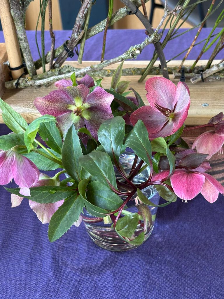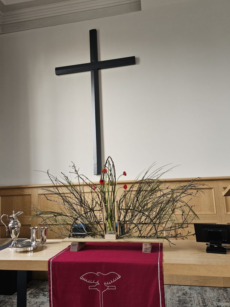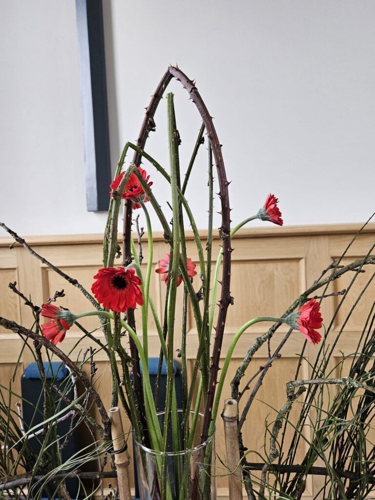 De laatste dagen van onze Heer, het ultieme lijden van de mensenzoon en de Zoon van God. Al talloze malen gehoord of gelezen, toch maakt het verhaal elke keer indruk. Gevangenneming, verhoor, vernedering, geseling, kruisiging en dood … Gods liefde en genade voor de wereld en ons, gegeven in dit offer. Jezus was bezield om zijn levensweg en nu deze lijdensweg te gaan. Tot aan het kruis en de dood toe. Het past ons om stil te worden. In de schikking ziet u doornen in de vorm van een kroon, ze onderstrepen het lijden. Verder zijn er rode anemonen verwerkt die staan voor het bloed van Jezus.