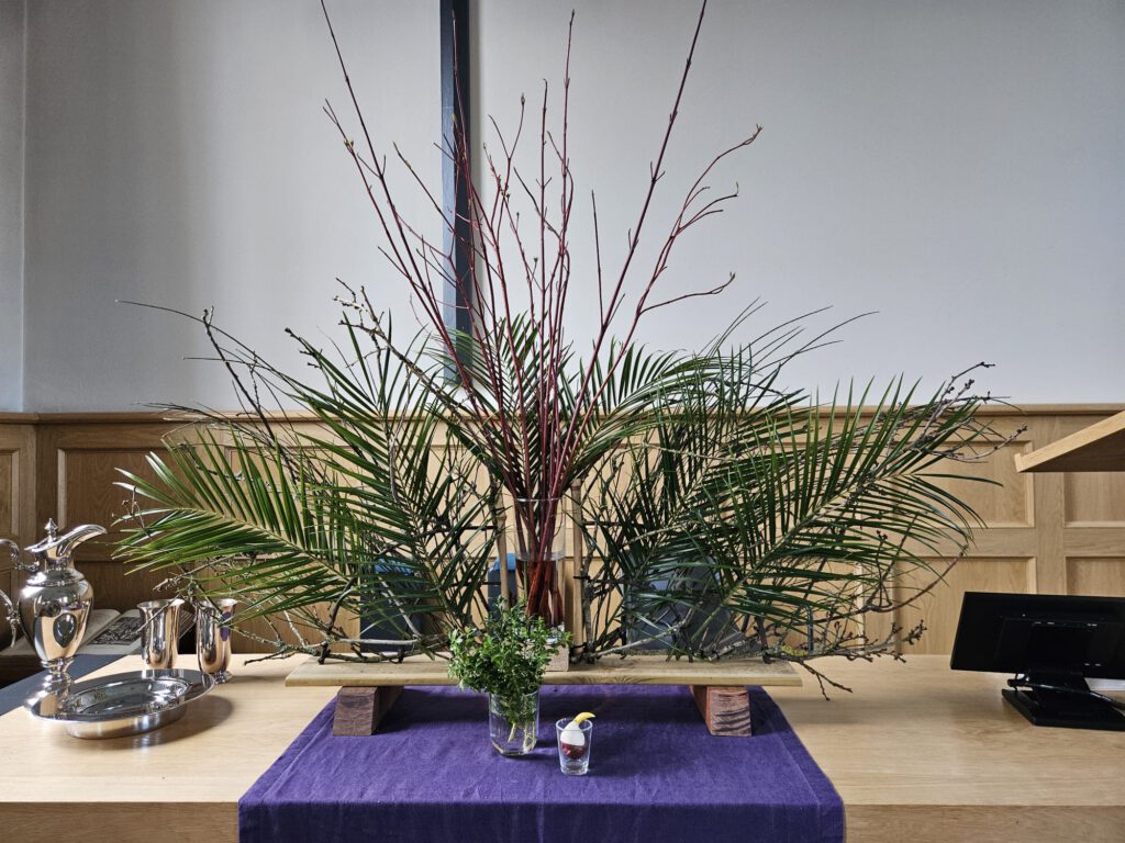 De heilige Geest waaiert breed uit, binnen en buiten de kerk. Willen we openstaan voor de tekens van de Geest uit onze omgeving? Willen we, op de drempel van de stille week, op deze zondag God uitbundig danken voor de gegeven liefde, zijn Zoon Jezus Christus. De rode takken staan voor de liefde van de Geest. De hoop wordt verbeeld in bloembollen, teken van de komende lente en in de groene kleur. De groene buxus is de kleur voor een goede toekomst. De palmbladeren zijn een teken van de feestelijke intocht.