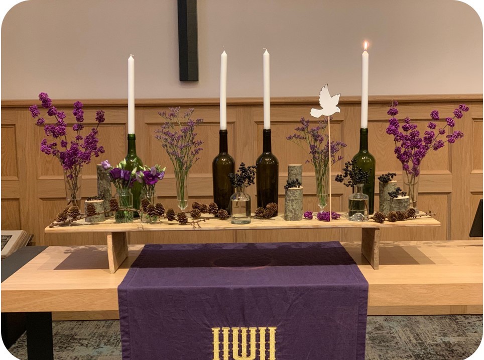 De adventtijd is begonnen en ook dit jaar is er weer een liturgische schikking. Het thema dit jaar is: vanuit het donker naar het licht bewegen. De schikking is gemaakt naar aanleiding van Matteüs 24: ‘Leer van de vijgenboom deze les: zo gauw zijn takken uitlopen en in blad schieten, weet je dat de zomer in aantocht is.’ Vijgenbomen groeien al eeuwenlang in warme streken. Ondanks droogte komen de nieuwe bladeren in het voorjaar tevoorschijn. Jezus wijst de vijgenboom aan en roept op om open te staan voor de toekomst. Jezus waarschuwt ook: wees waakzaam. Hij verzekert daarbij: mijn woorden zullen nooit verdwijnen. Vier kandelaars met kaarsen staan opgesteld. Tussen de eerste en tweede kandelaar zweeft een enkel duifje. Op de boomstammetjes en in de flesjes donkere materialen: callicarpa, limonium en dennenappels van de lariks. Paars is de kleur die ons tot inkeer roept. De donkere bessen en bloemen benadrukken het donker van de adventstijd. Eén kaars brandt. Maar dit donker wil ons niet verlammen. Het daagt ons uit om, net als de vijgenboom, open te blijven staan. Om te leren het mooie te zien in wat donker is, en de hoop te vinden die daar verscholen ligt.
