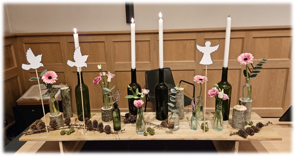 Voor deze kerstmorgen is de liturgische schikking gemaakt naar aanleiding van Johannes 1 vers 14: Het Woord is mens geworden en heeft bij ons gewoond. De evangelist Johannes begon zijn versie van het evangelie met een terugblik op de schepping. ‘In het begin was het Woord, het Woord was bij God. In het Woord was leven en het leven was het licht voor de mensen.’ Vanuit de schepping van hemel en aarde houdt God zich aan zijn Woord. Zijn Woord is mens geworden. Hoe wonderlijk, machtig en genadig is God: de komst van zijn eigen Zoon, Jezus Christus, het licht der wereld. Dat vieren wij met Kerst. Waar brengt de Geest ons in deze tijd? Laten wij zoeken naar momenten, plekken en manieren om ontvankelijk en opmerkzaam te zijn voor Gods Geest. De vier kandelaars worden vervangen door glazen flessen waarin amaryllissen staan – rijk en stralend. Verder zien we gipskruid, witte cyclaam en helleborus.