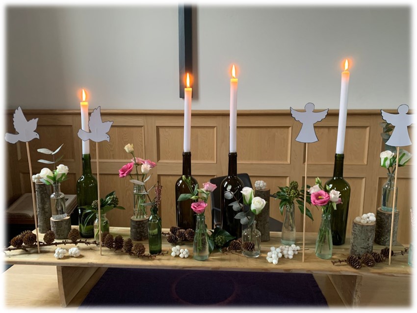 De liturgische schikking voor 4e advent is gemaakt naar aanleiding van Matteüs 1: vers 20: ‘ … verscheen hem in een droom een engel van de Heer … Wees niet bang je vrouw Maria bij je te nemen, want het kind dat ze draagt is verwekt door de heilige Geest.’ Jozef, afstammeling van David, was een rechtschapen man en wilde zijn aanstaande vrouw Maria niet in opspraak brengen. Toen kreeg Jozef een betekenisvolle droom. Wat zal hij verrast zijn door de boodschap van de engel! Zijn vrouw was uitgekozen. Hun zoon zou de langverwachte Immanuel worden. God wilde zich op bijzondere wijze openbaren in een mens: Jezus Christus. Toen hij wakker werd deed Jozef wat de engel had opgedragen. Een mensenleven kan een onverwachte wending krijgen. Houden wij in ons eigen leven rekening met onverwachte scenario’s? Laat je, net als Jozef, verrassen door het werk van de Geest. Er staan vier kandelaars met kaarsen opgesteld. Tussen de eerste en tweede kandelaar zweven twee duiven, en tussen de derde en vierde kandelaar verschijnen twee engelen. Op de boomstammetjes en in de flesjes staan nu witte sneeuwbes, witte tulpen, heide, klimopbessen en larix. Het wordt steeds lichter. Het licht nadert, versterkt door de stralende engel die Jozef bezoekt. Vier kaarsen branden. De engelen zijn dragers van de goede boodschap: het Kind is onderweg. Het licht komt dichterbij.